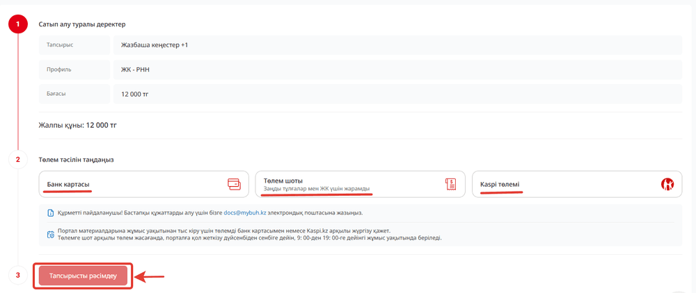 Тапсырыс рәсімдеу терезесі ашылады. Ыңғайлы төлем әдісін таңдаймыз - банк картасы, төлем шоты, Kaspi төлемі. "Төлем шотымен" тарифті төлеу кезінде, активация үшін техникалық қолдау чатына төлем тапсырмасын жіберу қажет.