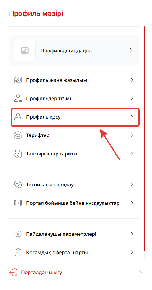 Порталмен жұмыс істей жалғастыру үшін профиль жасау қажет. "Мәзір" бөлімін ашып, "Профиль қосу" таңдаңыз.