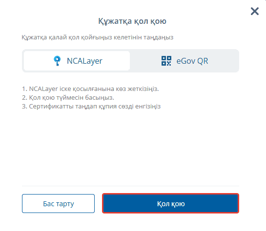 NCALayer іске қосылғанына көз жеткізіңіз. «Қол қою» батырмасын басыңыз. Сертификатты таңдаңыз және парольді енгізіңіз.