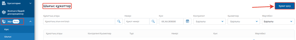 Бұл бөлімде сіз жасаған және контрагентке немесе қызметкерге жіберуге арналған құжаттар көрсетіледі. Мұнда «Сату және сатып алу» және «Контрагенттер» бөлімдерінен автоматты түрде құжаттар да кіреді. Іздеу және қарау үшін атауы, нөмірі, күні, контрагенті, қызметкері немесе құжаттың мәртебесі бойынша сүзгілер қолжетімді.