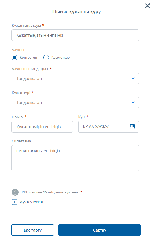 Жаңа құжат қосу үшін міндетті өрістерді толтыру қажет: