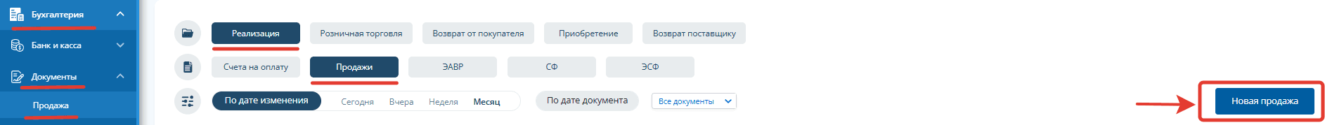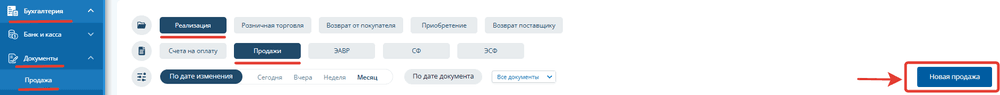 Чтобы сформировать электронный акт выполненных работ, для начала необходимо создать АВР.Вам нужно перейти в раздел «Бухгалтерия – Документы – Продажа», в подраздел «Продажи» и нажать на кнопку «Новая продажа». Как сформировать АВР смотрите в другой инструкции.