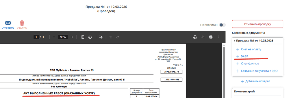 После сохранения документа перед вами открывается страница просмотра документа в печатном виде. На этой странице вы можете изменить документ, скачать, распечатать или удалить. Также вы можете отправить готовый документ на почту себе или вашему контрагенту нажав на кнопку «Отправить».