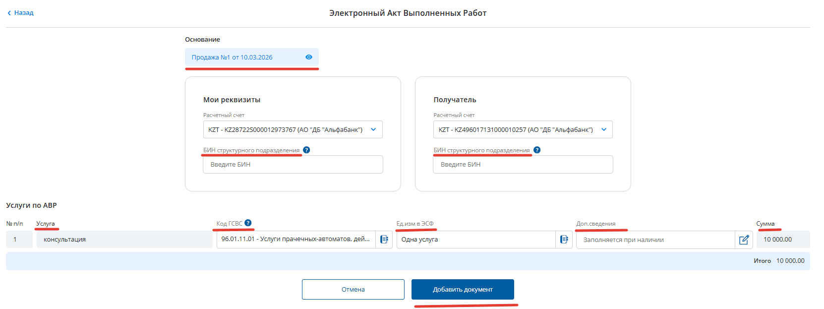 Данные по расчетному счету подтягиваются автоматически из АВР, строка БИН структурного подразделения заполняется только тогда, если получателем ЭАВР является структурное подразделение/филиал. Наименование услуги заполнилось автоматически, необходимо выбрать код ГСВС из списка, он необходим для заполнения и отправки ЭАВР. Указываете единицу измерения в ЭСФ и при необходимости можете заполнить дополнительные сведения. Нажмите на кнопку «Добавить документ».