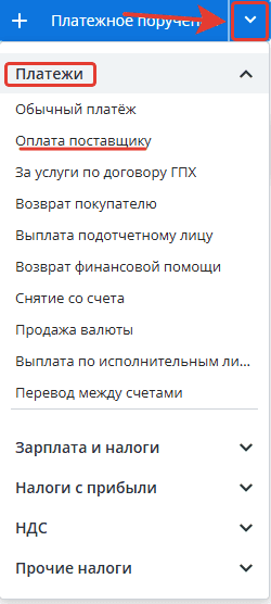 В выпадающем списке выберите какой платеж вы хотите совершить. Выберите конкретный вид, например, "Платежи – Оплата поставщику".