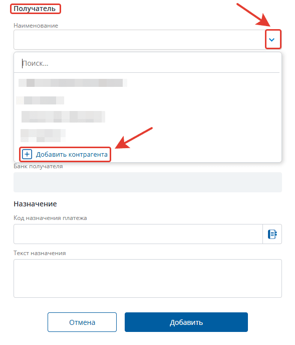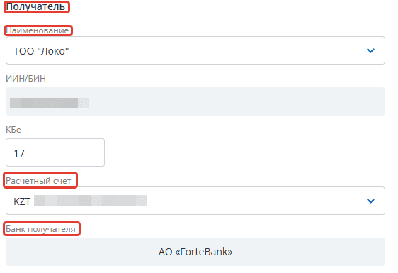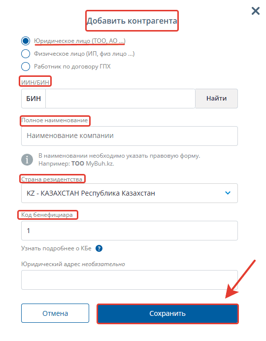 Введите получателя, если в справочнике нет нужного контрагента нажмите на "Добавить контрагента" - выберите форму собственности – укажите ИИН или БИН компании – наименование – код бенефициара – для ТОО это 17 – и страну резидентства. Нажмите "Сохранить" и выберите этого контрагента в списке. Укажите расчетный счет получателя. Если это вновь введенный контрагент, то таким же способом добавьте расчетный счет. Введите номер счета и выберите необходимый банк. БИК и Валюта подтянутся автоматически.