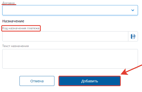 Вы можете добавить договор, если он имеется. Далее укажите код назначения платежа. Текст назначения заполнять необязательно. Нажмите "Сохранить".