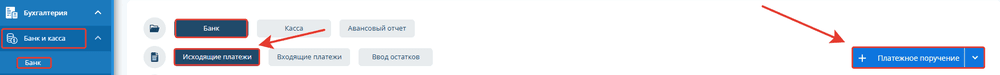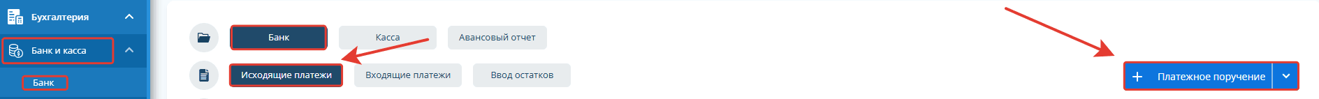 Чтобы сформировать исходящее платежное поручение, например, оплату поставщику или в бюджет, выберите раздел "Бухгалтерия - Банк - Банк и касса - Исходящие платежи", нажмите "Добавить платежное поручение".