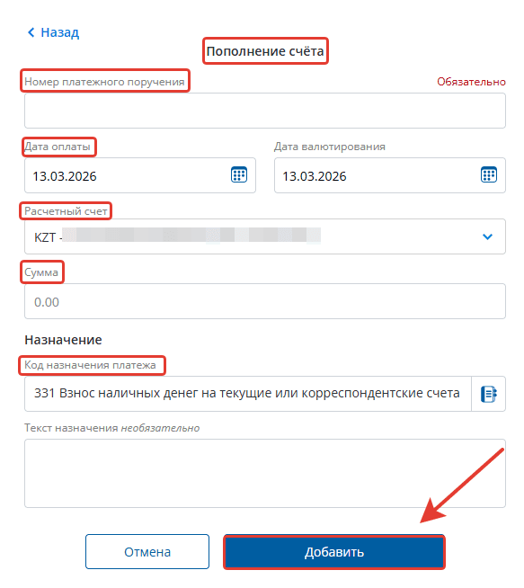 Выберите вид платежа, например, «Пополнение счета». В открывшемся окне заполните входящий номер платежного поручения, дату прихода денег на счет, сам расчетный счет, сумму и КНП. Нажмите «Добавить».