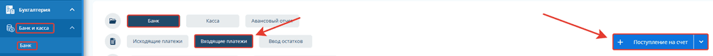 Если вам на счет поступили деньги от поставщика или возвратные, то в сервисе необходимо зайти в раздел «Бухгалтерия - Банк и касса – Банк – Входящие платежи» - добавить «Поступление на счет».