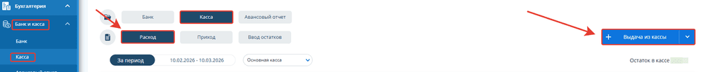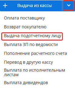 Чтобы создать расходный кассовый ордер выберите «Расход – Выдача из кассы».