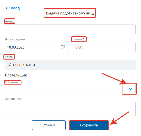 Выберем к примеру «Выдача подотчетному лицу». Номер проставляется автоматически по порядку. Выберите дату расхода по кассе, введите сумму операции. Если эта операция прошла по дополнительной кассе, то выберите нужную кассу. В данном случае выберите работника, которому выдается подотчетная сумма. Работник должен быть ранее введен. И если необходимо распишите основание. Нажмите «Сохранить».
