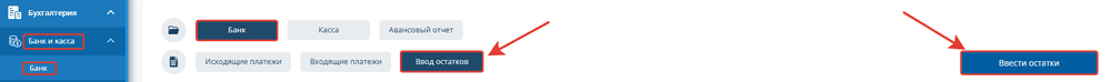 Чтобы ввести остатки на банковском счете выберите раздел "Бухгалтерия - Банк и касса", нажмите "Банк – Ввод остатков – Ввести остатки".