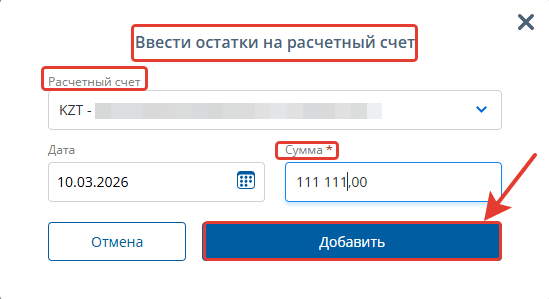 В открывшемся окне выберите расчетный счет, по которому вводите остаток, дату на которую остаток зафиксирован и непосредственно сумму остатка. Нажмите "Добавить".