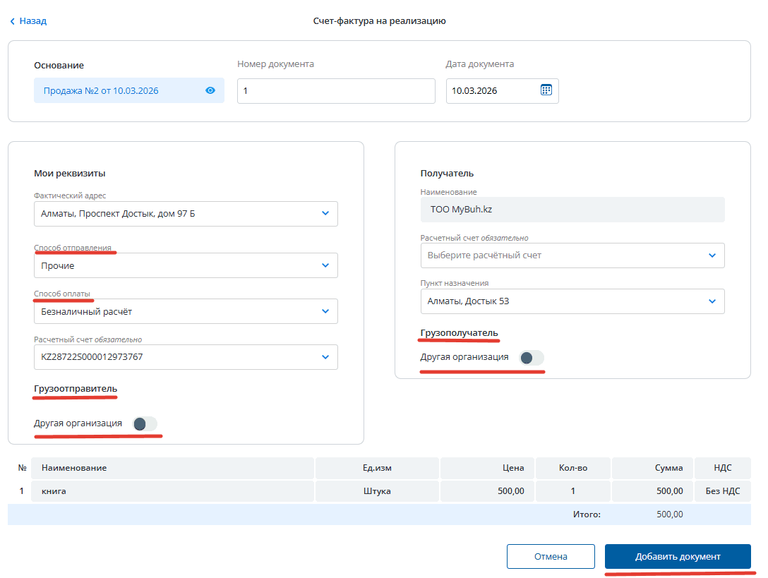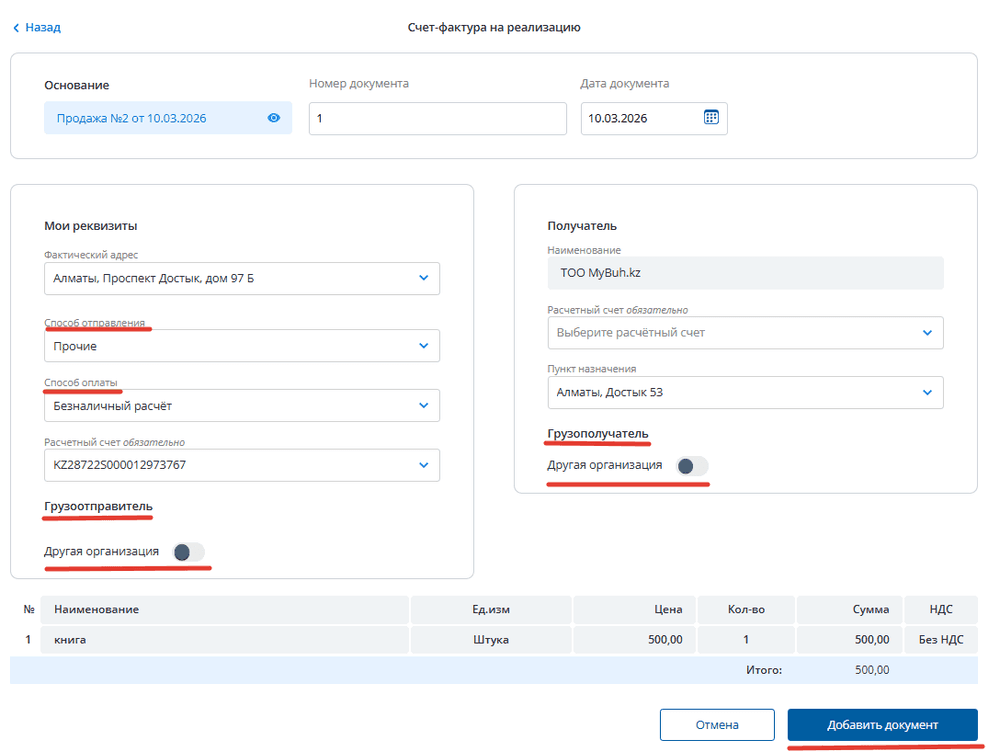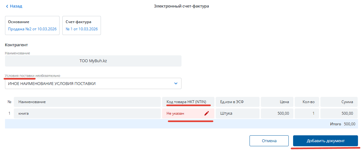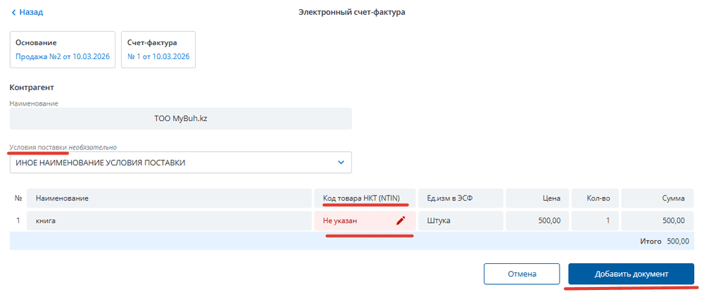 Здесь вам необходимо выбрать корректное условие поставки и Код товара НКТ (NTIN) если Вы ранее не указали его в разделе "Склад" при добавлении номенклатуры, остальные данные подтянулись из счета фактуры. - Нажмите «Добавить документ».