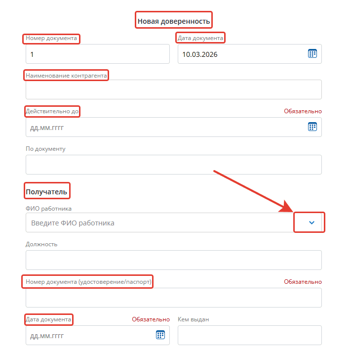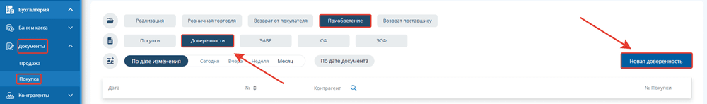 Чтобы выписать доверенность на поступление товара, перейдите в подраздел «Приобретение», вкладка «Доверенности», нажмите «Новая доверенность».