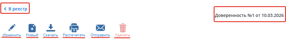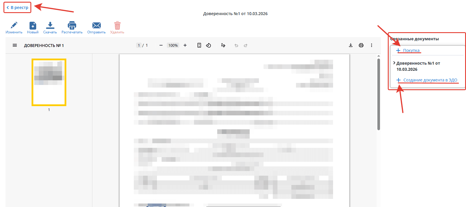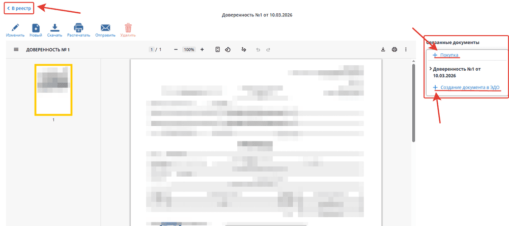 Также имеется возможность создания документа в ЭДО. Отсюда из предпросмотра, вы можете перейти в реестр подобных документов, нажав на кнопку «в реестр» или связанный документ справа, также вы можете ввести новую покупка на основе доверенности.