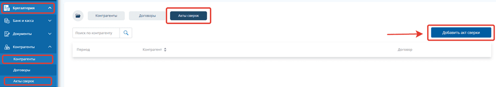 В разделе «Контрагенты» откройте подраздел «Акты сверок», нажмите «Добавить акт сверки».