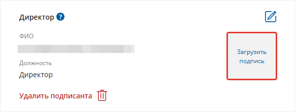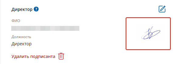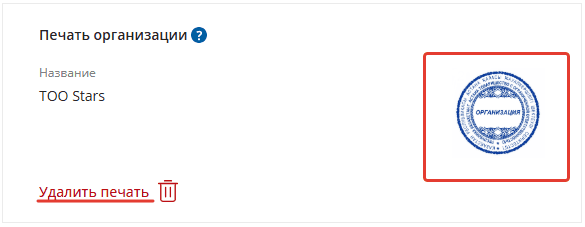 Загрузите печать компании также в формате PNG на прозрачном фоне, размером до 1 мб, изображение не должно иметь пустых областей по краям. При необходимости можно удалить текущую подпись и добавить новую.