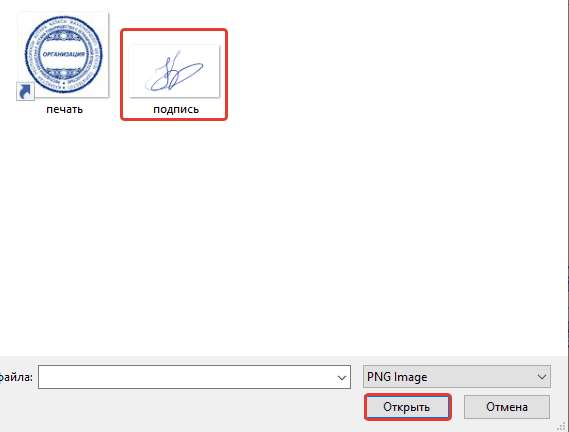 Теперь загрузите их подписи в формате PNG на прозрачном фоне, размером до 1 мб. При необходимости можно заменить старую печать на новую.