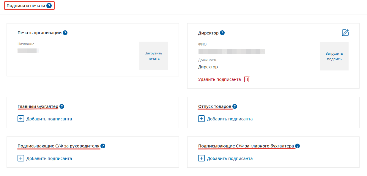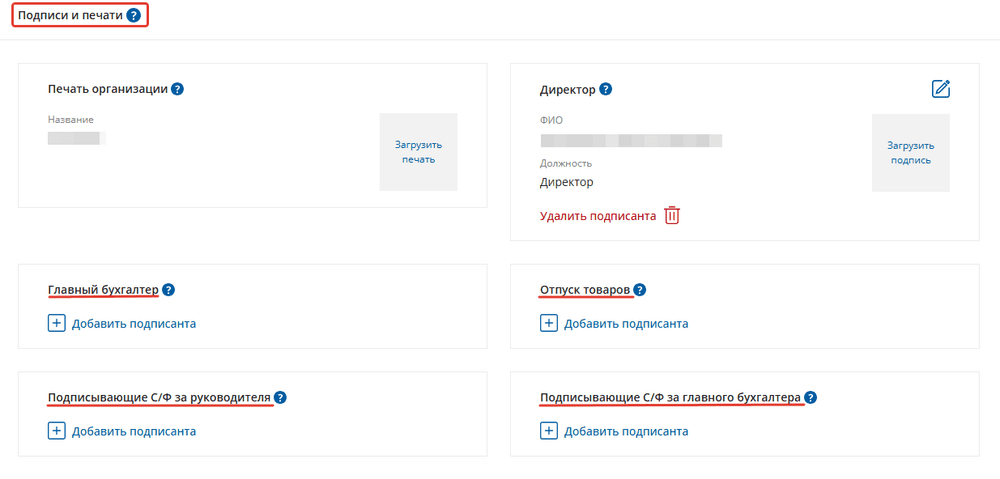 Вы можете закрепить подписи ответственных сотрудников. Добавьте подписантов – директор, главный бухгалтер, и т.д.