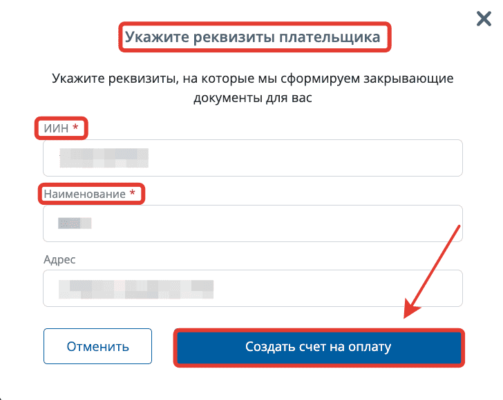 2. При выборе "Счет на оплату" нужно указать реквизиты плательщика: ИИН или БИН, наименование, адрес заполнять необязательно, далее нужно нажать "Создать счет на оплату".