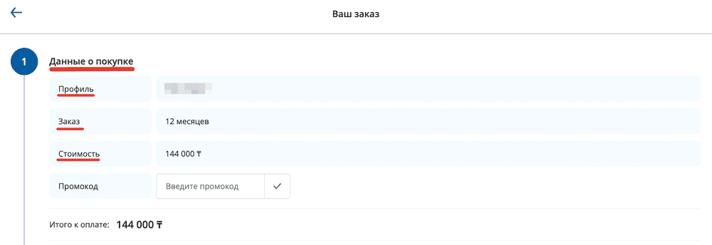 После выбранного тарифа, у Вас сформируется заказ где будет прописано: профиль на который приобретается подписка, срок на который приобретается подписка и стоимость подписки.