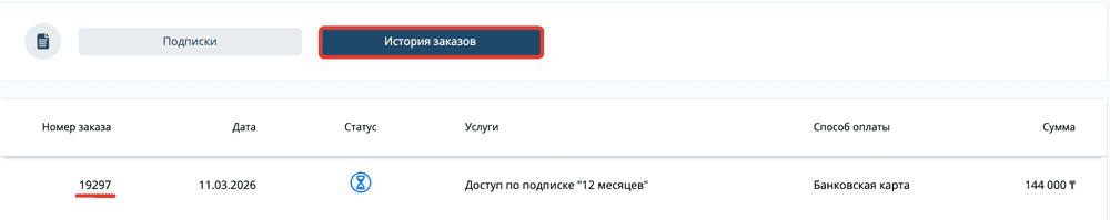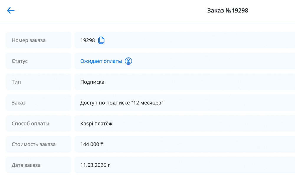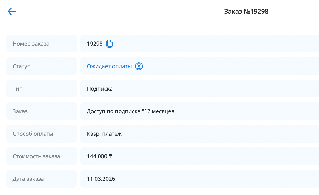 3. При оплате через Kaspi.kz у Вас также сформируется заказ, где будет прописано: номер заказа, статус, способ оплаты, срок на который приобретается подписка и стоимость.