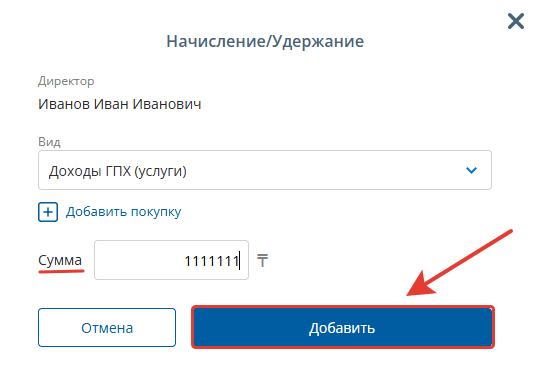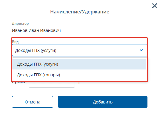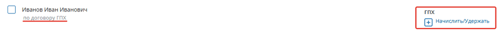 Попробуем начислить доход по договору ГПХ. Нажмите "Начислить" или "Удержать",