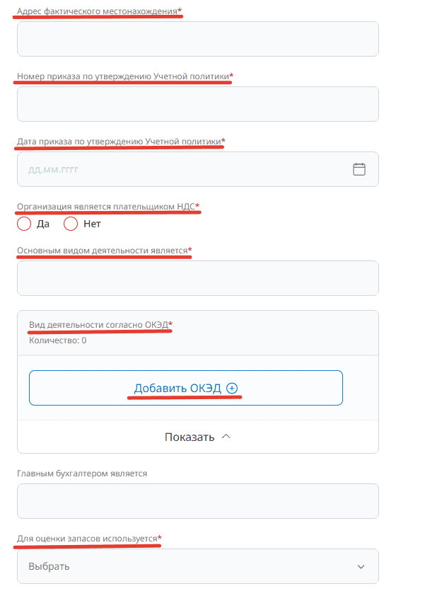 Все обязательные поля отмечены и должны быть заполнены для перехода к следующему этапу.