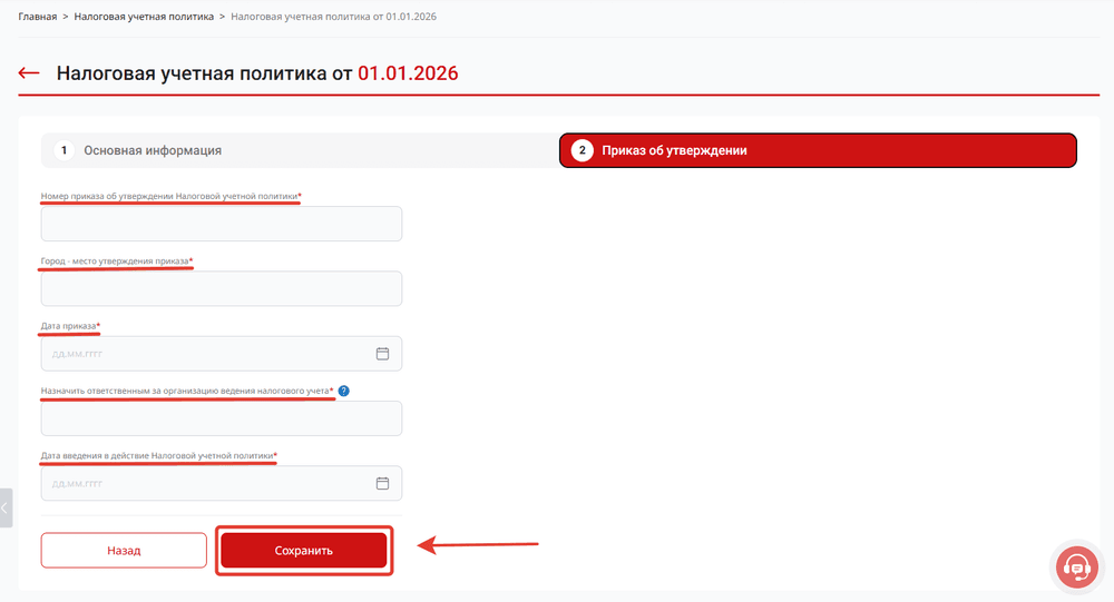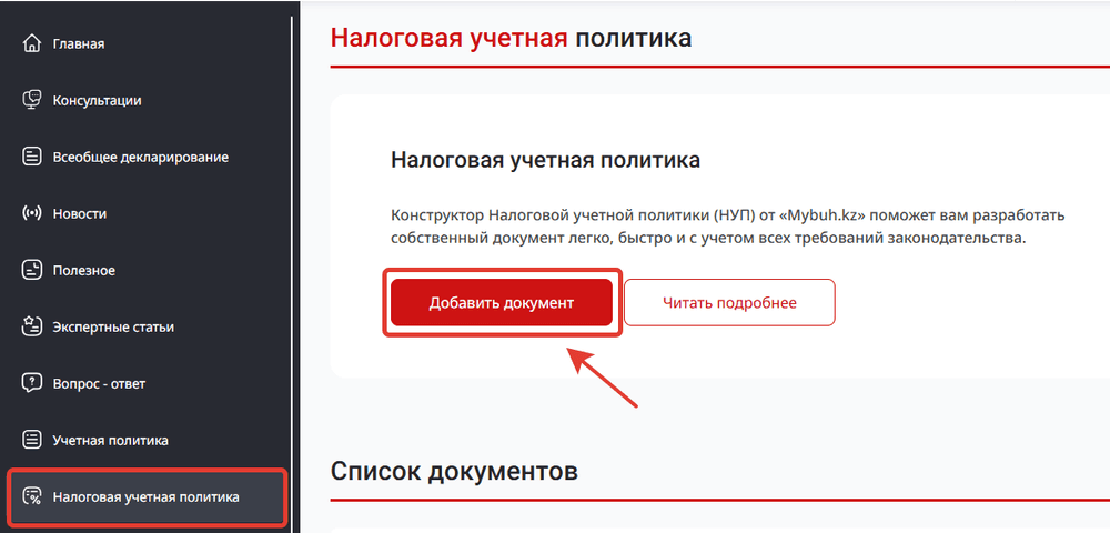 Чтобы создать налоговую учётную политику, перейдите в меню справа и выберите раздел "Налоговая учётная политика". Затем нажмите на кнопку "Добавить документ".