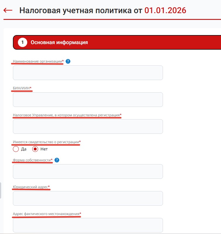 В ней указываются реквизиты компании: наименование, БИН/ИИН, налоговый орган регистрации, наличие свидетельства, форма собственности, юридический и фактический адреса. Также отражаются данные об утверждении учетной политики - номер и дата приказа.